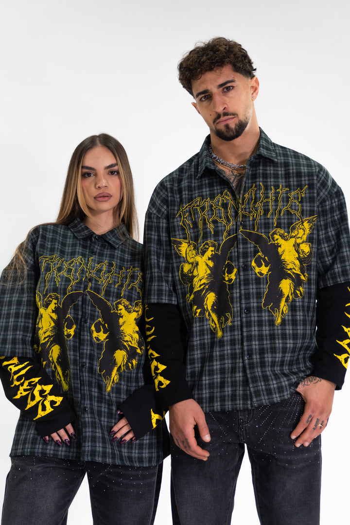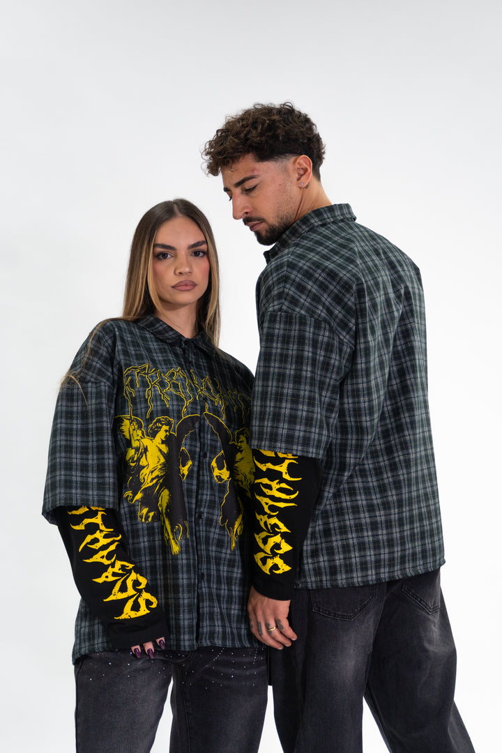 Camicia oversize a quadri con maxi stampa grafica “ANGELS” in giallo ad alto impatto, ispirata all’estetica rock–street. Il contrasto tra il tartan dark e gli angeli in stile graphic dona un look deciso e distintivo. Il layering simulato con le maniche lunghe nere e le stampe flame crea un effetto doppio strato che aggiunge carattere e profondità al capo. Perfetta da indossare sopra long sleeve o con denim larghi per un outfit forte e contemporaneo.