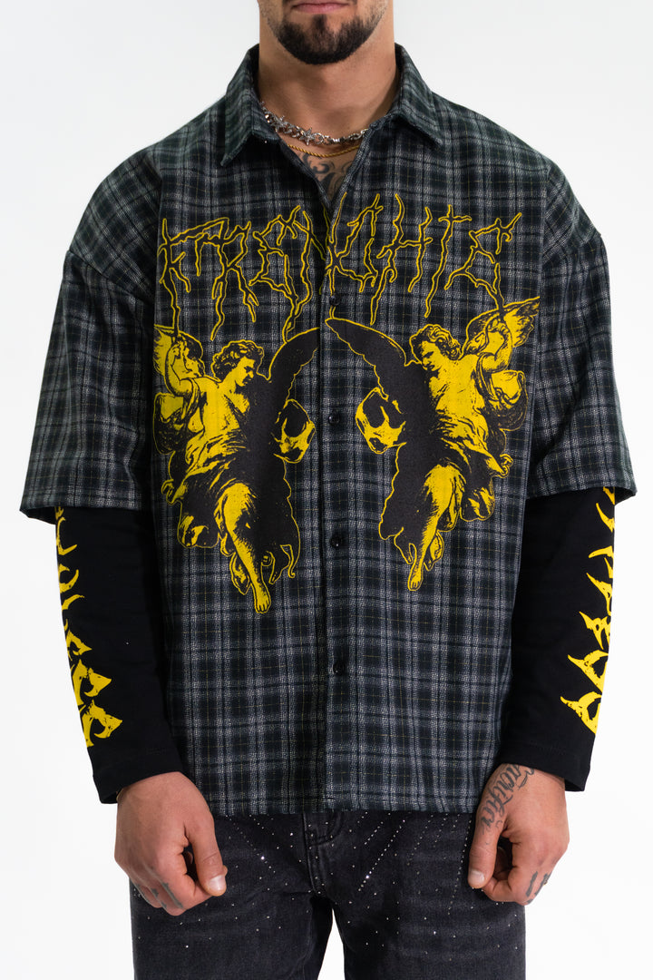 Dettagli: Stampa “ANGELS” frontale in giallo, lettering style metal, effetto layering con maniche lunghe nere stampate, pattern check dark, chiusura a bottoni